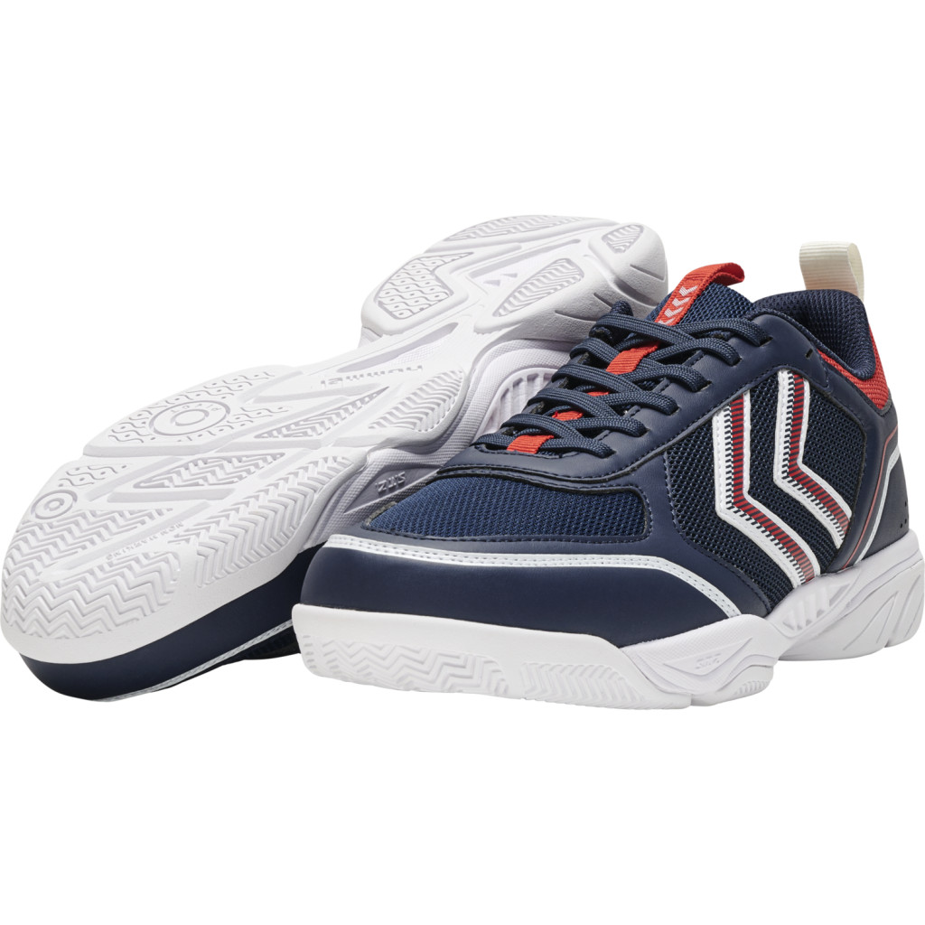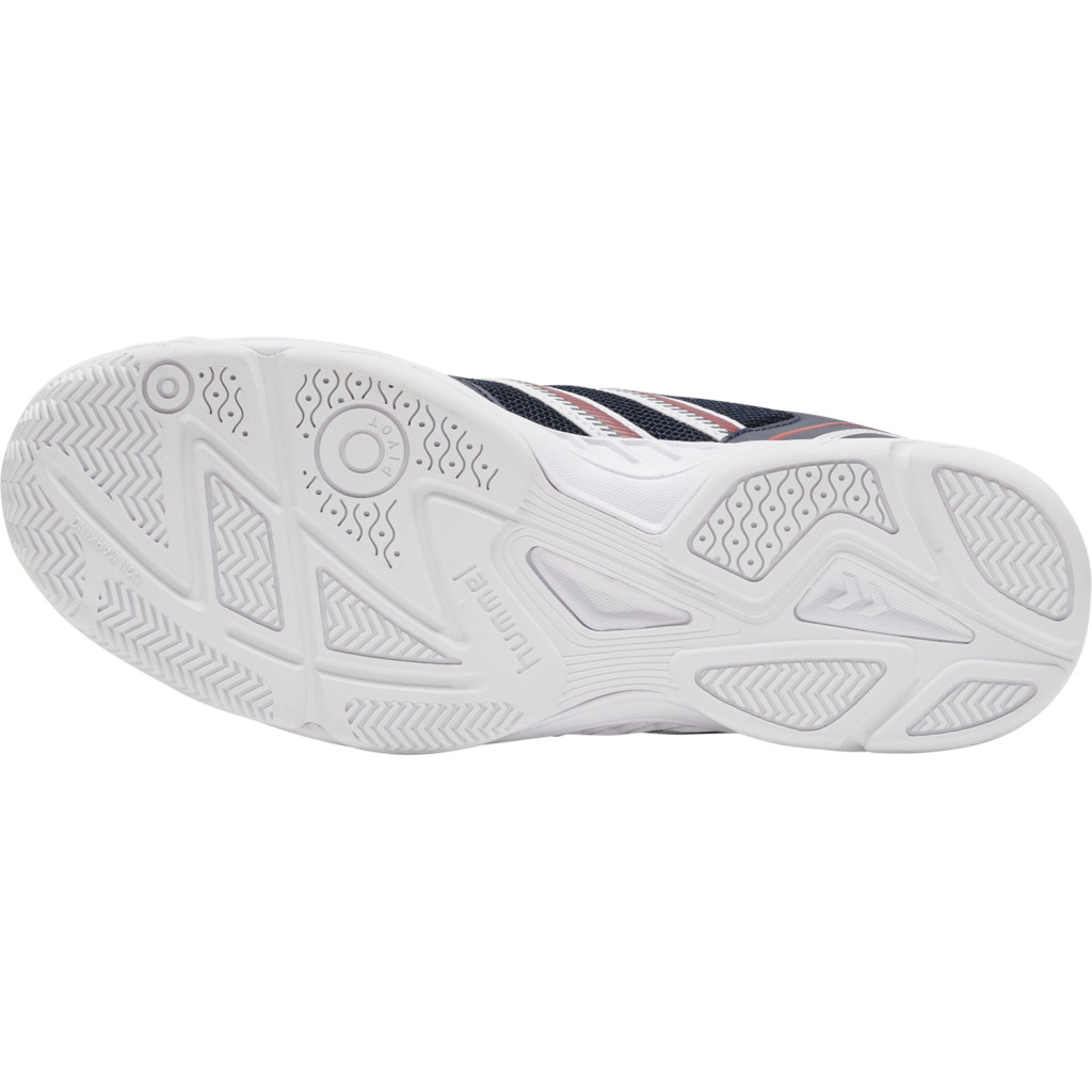 A hummel® AERO TEAM 2.0 egy sokoldalú beltéri sportcipő, amely ötvözi a fenntarthatóságot, a kényelmet és a teljesítményt. A felsőrész 100%-ban újrahasznosított, légáteresztő mesh anyagból készült, amit szintetikus fedőrétegek egészítenek ki a jobb tartás és forma megtartása érdekében.